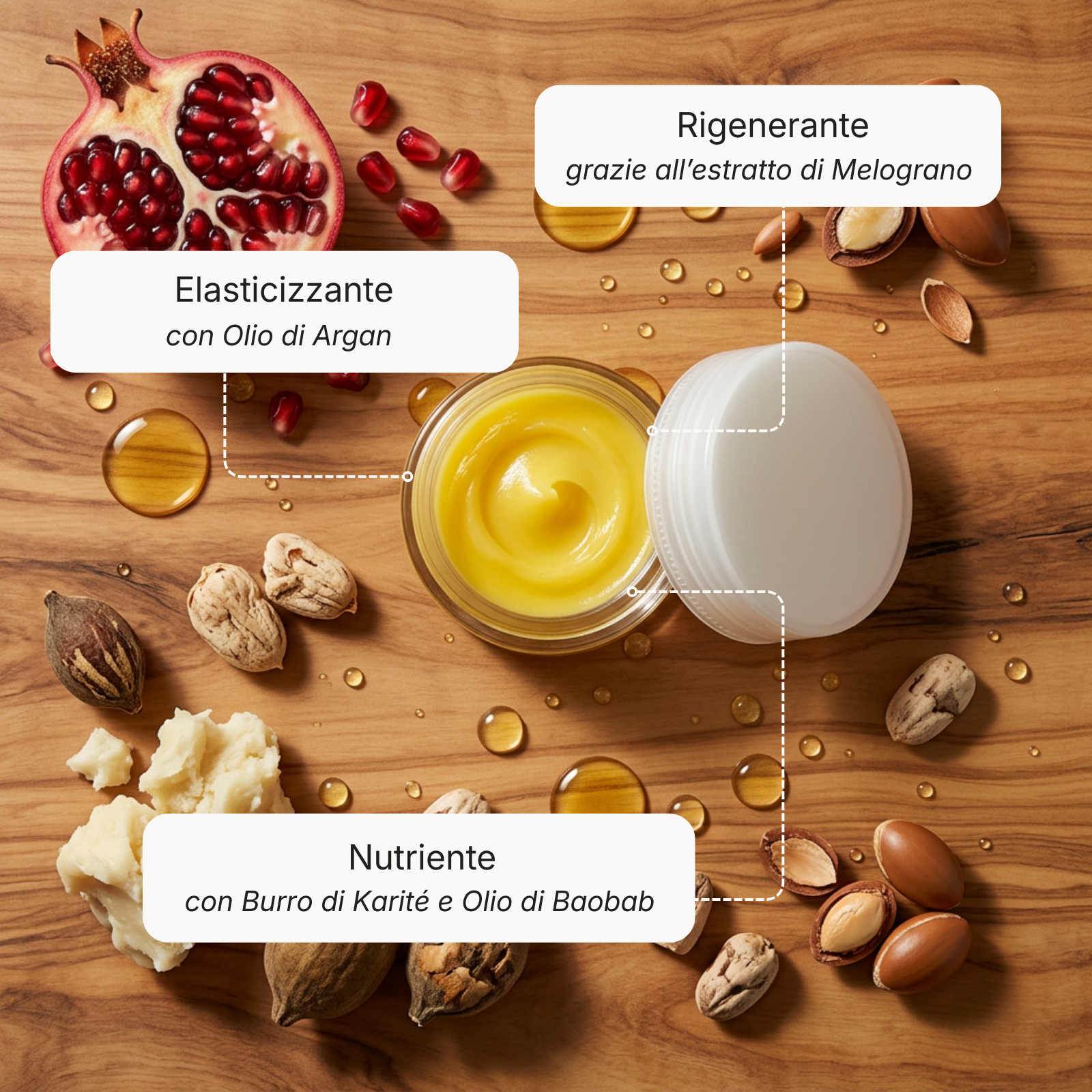 Dona ai tessuti morbidezza, nuova forza e restituisce capacità di auto-rigenerarsi, frenando il passo del tempo. Un processo di age reversing. Grazie ai suoi estratti di Melograno e Argan è un ottimo alleato contro le rughe.