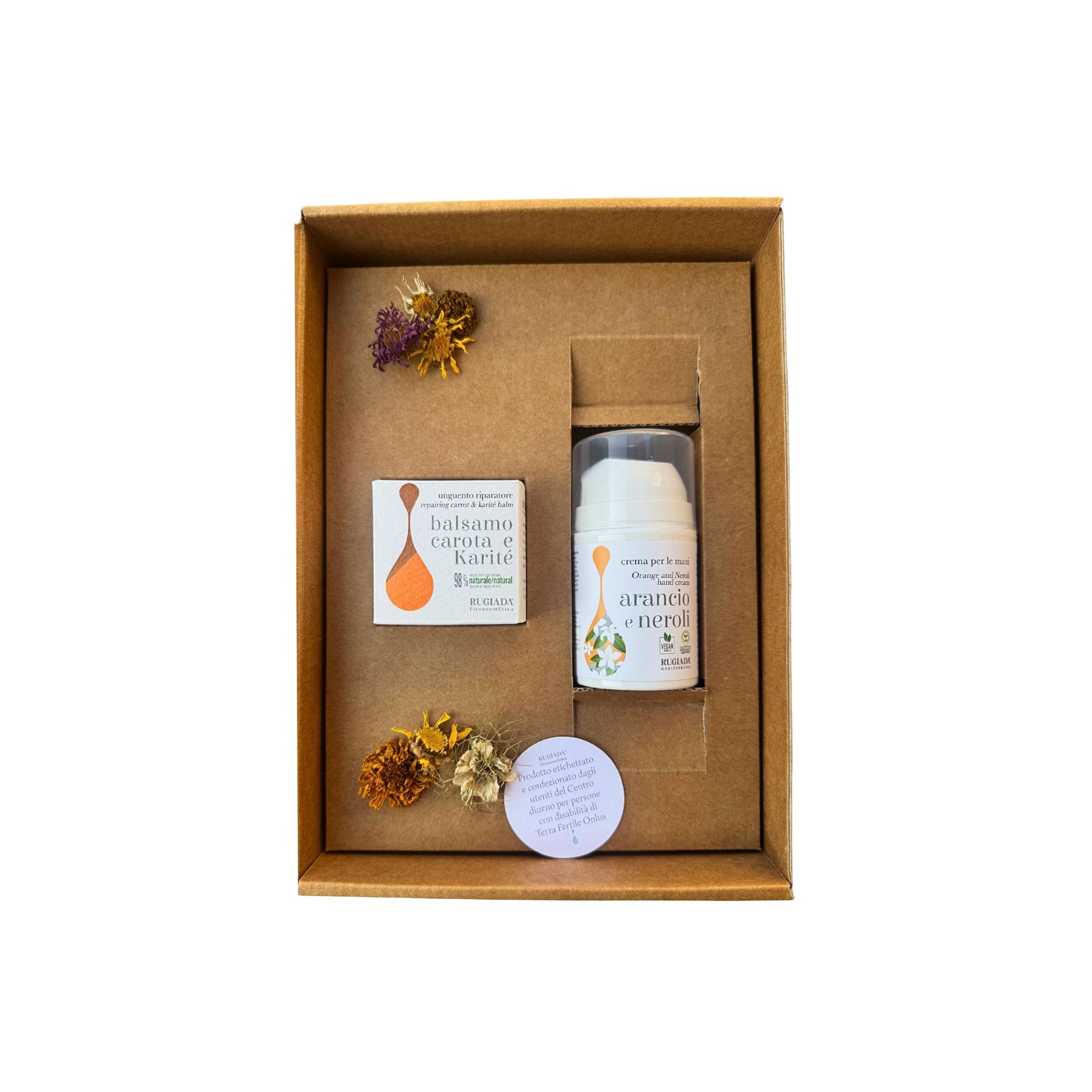 Un cofanetto regalo che include una Crema mani Arancio e Neroli 50 ml e Balsamo labbra Carota e Karité 15 ml. Per proteggere mani e labbra, particolarmente delicati ed esposti agli insulti di freddo e aria.
