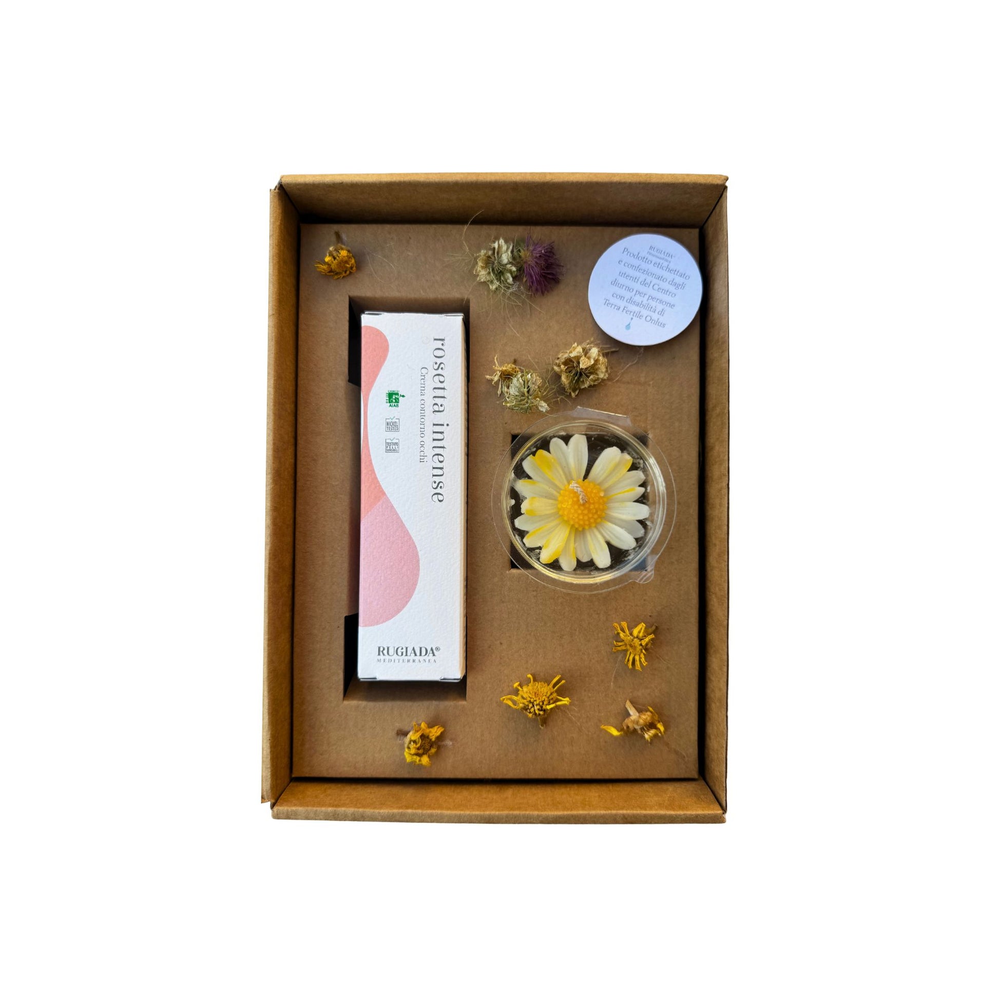 Comprende una crema contorno occhi, Rosetta Intense formato 30 ml, biologica, e una cendelina in cera vegana profumata all'ambra egiziana. Ottima per profumare il cassetto.